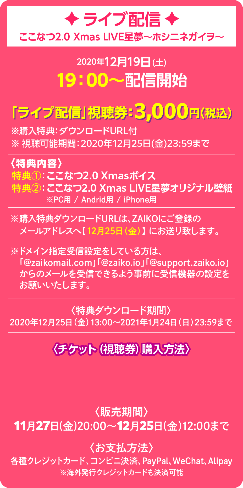 - ■視聴可能期間:2020年12月25日(金)23:59まで(ライブ配信後に再配信処理を行いますのでご覧いただけない時間がございます)