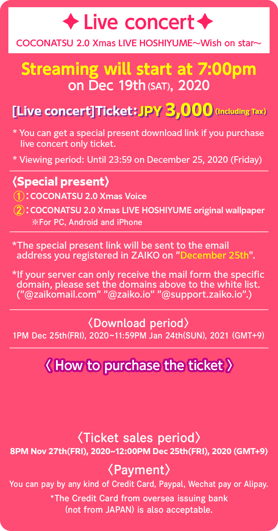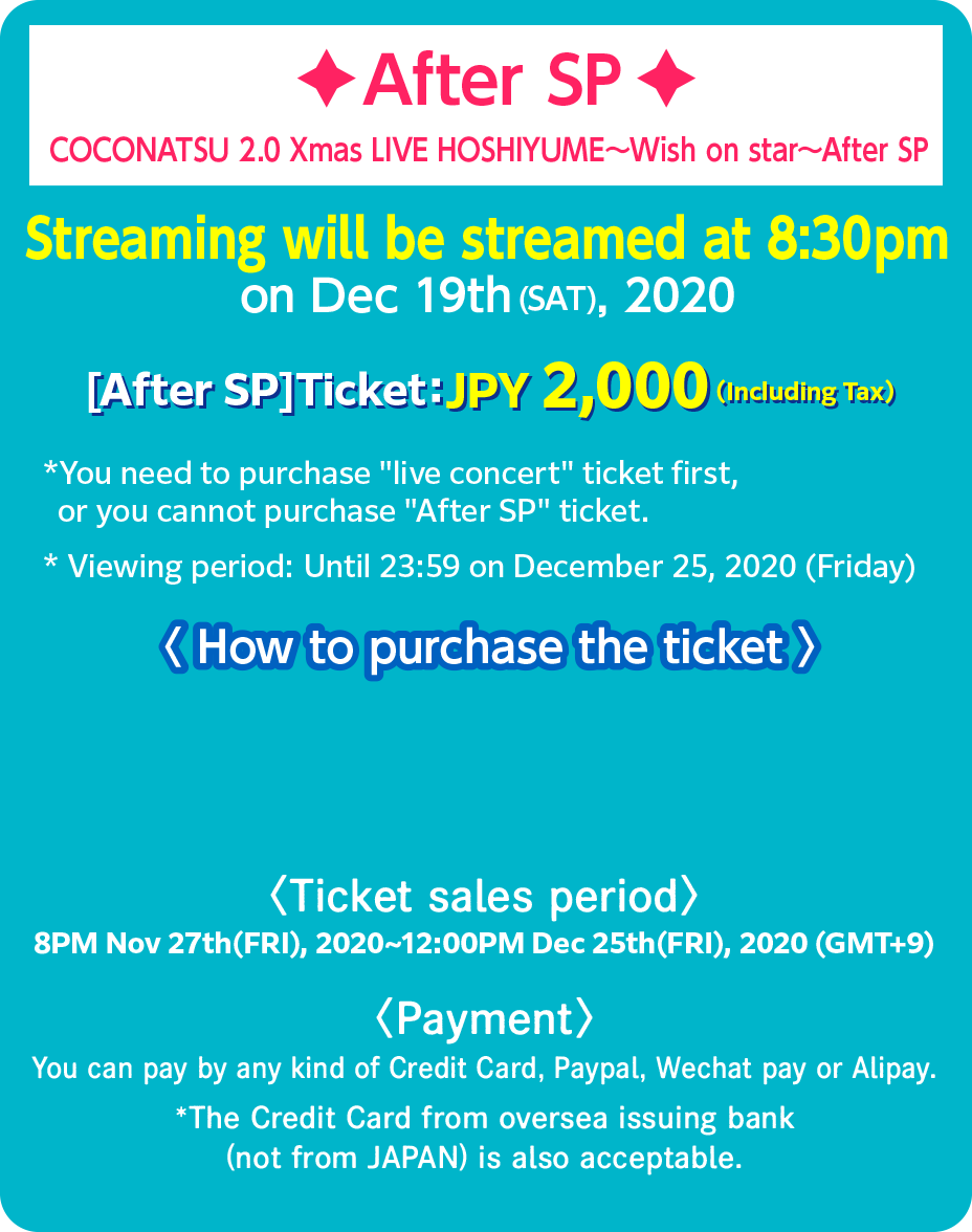 - ■The ticket sales of this concert will be end at 12PM (GMT+9) on Dec 25th (FRI). And stream archive can be watched until 11:59PM (GMT+9) on Dec 25th (FRI).